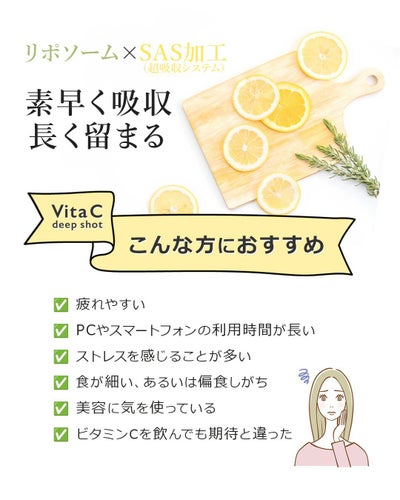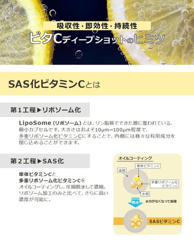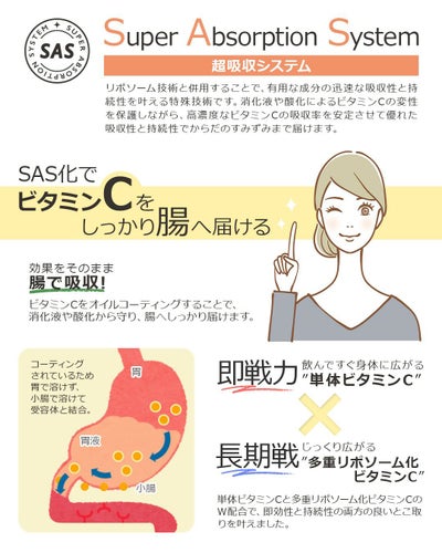リポソーム化、オイルコーティング、脱水高濃度化を採用し吸収性と持続性に優れたビタミンCサプリです。