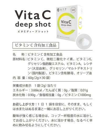 ビタミンC、微粒二酸化ケイ素、ビタミンE、グリセリン脂肪酸エステル、ビタミンA、レシチン(大豆由来)、グリセリン/マルトデキストリン(国内製造)、ビタミン含有酵母、オリーブ油