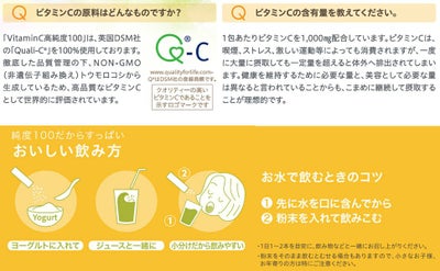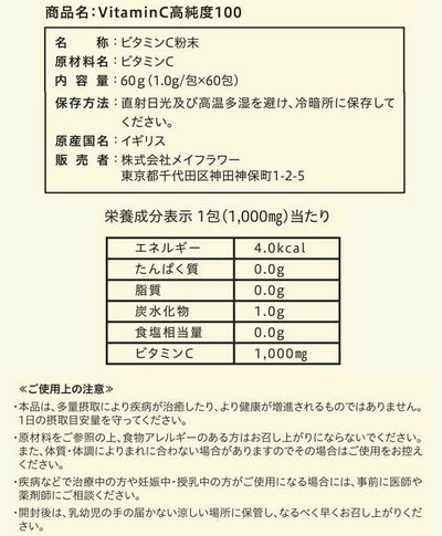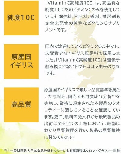 「VitaminC高純度100」は、純度100%のビタミンCのみを使用しています。