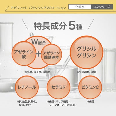 肌の過剰な皮脂を抑制し、水分・油分のバランスを整えて理想のなめらか肌へと導くバランシングローションがアゼライン酸*配合「アゼフィットシリーズ」から新登場。 アゼライン酸のほか、レチノール* 、グリシルグリシン* 、セラミド* 、ビタミンC *など今話題の成分から定番の成分まで19種類の美容成分がたっぷり。 レチノールとセラミドを併用することで肌土台を整えるため、レチノールが使えなかった方にもおすすめです。  *全て整肌成分 ◆アゼライン酸×グリシルグリシン×レチノール×セラミド×ビタミンC配合 過剰な皮脂を抑え、水分と油分のバランスを整えます。 ◆アゼライン酸、アゼライン酸誘導体をW配合 毛穴の開きや様々な肌トラブルにマルチな効果を発揮、ゆるぎないなめらかな肌へと導きます。 ◆グリシルグリシン高配合 分子量が小さなペプチドの1種で浸透力が高く、うるおいを与えて乾燥を防ぎながら、肌のキメを整えられます。繰り返し使用することで肌のキメを整え、大人の肌をキュッとひきしめ、肌トラブルのないなめらかな肌へと導きます。 ◆レチノール×セラミドの組み合わせ配合 レチノールの副反応によって低下した肌バリア機能をセラミドが補います。 ◆話題のスキンケア成分「ヒト脂肪細胞順化培養液エキス」も配合。 ニキビケアで疲れたお肌をハリ、ツヤのある肌へと導きます。 ヒト脂肪細胞順化培養液エキス 1)日本人由来の培地を使用し幹細胞培養液を使用 一般的には海外由来が多いなか、日本国内で日本人から採取した幹細胞で3D培養した日本産を採用。 2)グロースファクターの含有量の多い3D培養を採用 現在の市場に多い2Dより、今回採用した3D培養はグロースファクターの含有量が多く、より有用性が高いとされています。