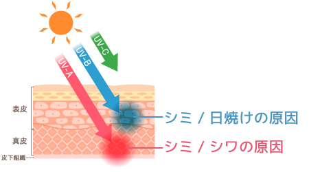 一般的に紫外線(UV)には3つの種類があります。中でも UV-B 波は肌表面の炎症によりシミや日焼けの原因に、UV-A 波は窓ガラスなども通り抜け、肌の奥にあるコラーゲンなどにダメージを与え、深いシミやシワの原因となってしまいます。